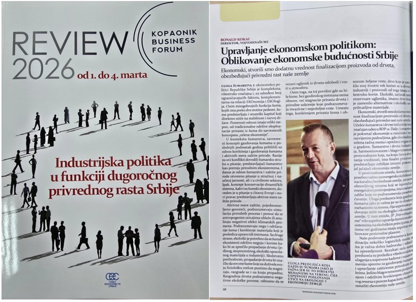 U okviru foruma direktor JP „Vojvodinašume“, Roland Kokai je kroz intervju „Upravljanje ekonomskom politikom: Oblikovanje ekonomske budućnosti Srbije“, govorio o kompleksnoj ulozi šumarstva u savremenoj ekonomskoj politici, kao i o značaju održivog upravljanja šumskim resursima u kontekstu dugoročnog ekonomskog razvoja Srbije. Kokai je tom prilikom istakao da šume, pored brojnih ekoloških funkcija, predstavljaju i strateški resurs koji direktno utiče na stabilnost i razvoj države. Posebno je naglasio da održivo gazdovanje šumama doprinosi očuvanju rezervi ugljenika, ali i stvaranju ekonomske vrednosti kroz finalizaciju proizvoda od drveta.